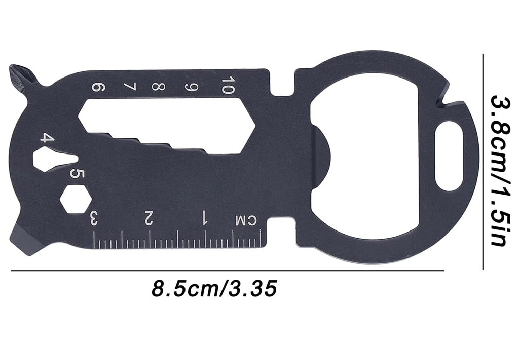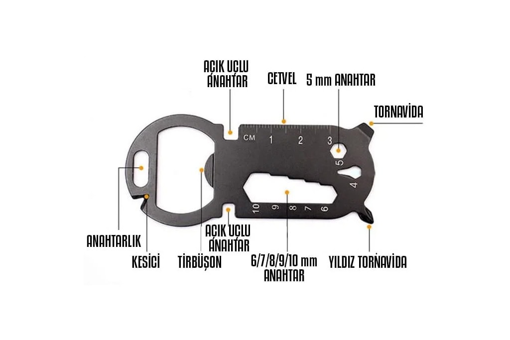 Yalnızca 2 mm kalınlığında olan bu çok fonksiyonlu anahtarlık, pantolonunuzun en küçük cebine ya da cüzdanınıza rahatlıkla sığabilecek ultra ince tasarımıyla öne çıkar. Mat siyah paslanmaz çelik malzemesi sayesinde hem dayanıklı hem de şık bir kullanım sunar. Hafif yapısı ve kompakt boyutlarıyla ister şehirde ister doğada yanınızdan ayırmak istemeyeceğiniz bir araçtır.